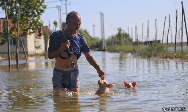 在山東省壽光市的村落,一名男子帶著兩隻小豬穿越淹水的街道。這裡在日前遭逢颱風倫比亞(Typhoon Rumbia)侵襲。