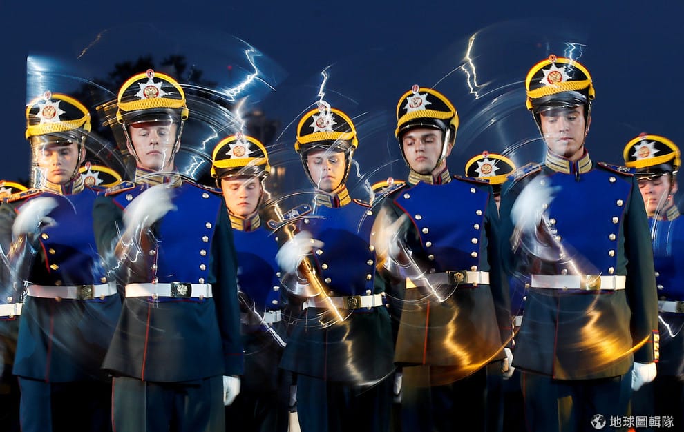 時逢國際軍樂節,俄國儀仗隊154 Preobrazhensky Regiment的成員在斯巴斯克塔(Spasskaya Tower)前賣力地表演著。