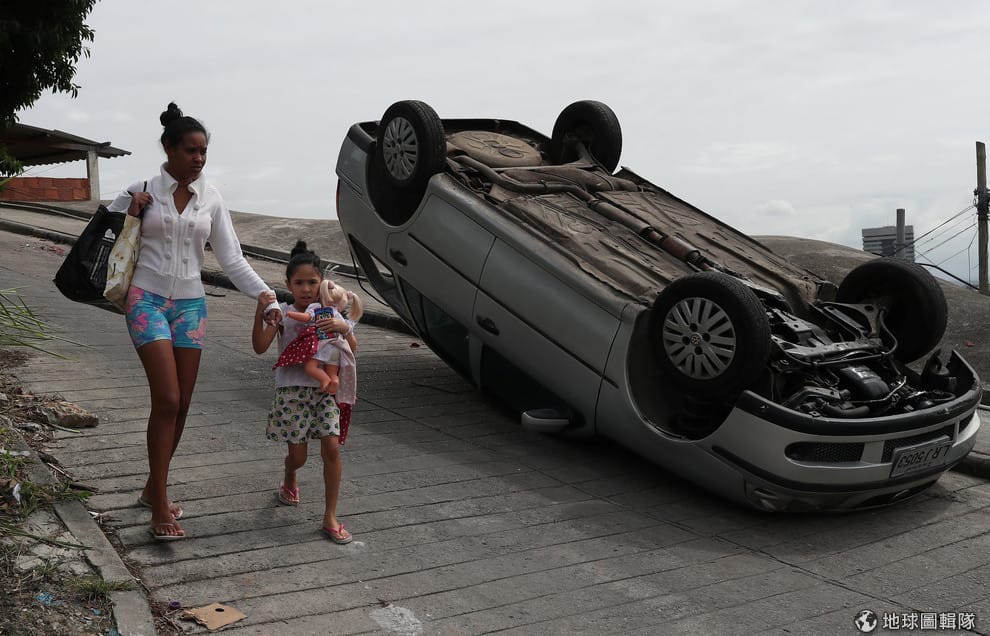 一對母子走過一台上下顛倒的轎車。據車主人所稱,這台車是在警察和毒販發生衝突時受到波及。