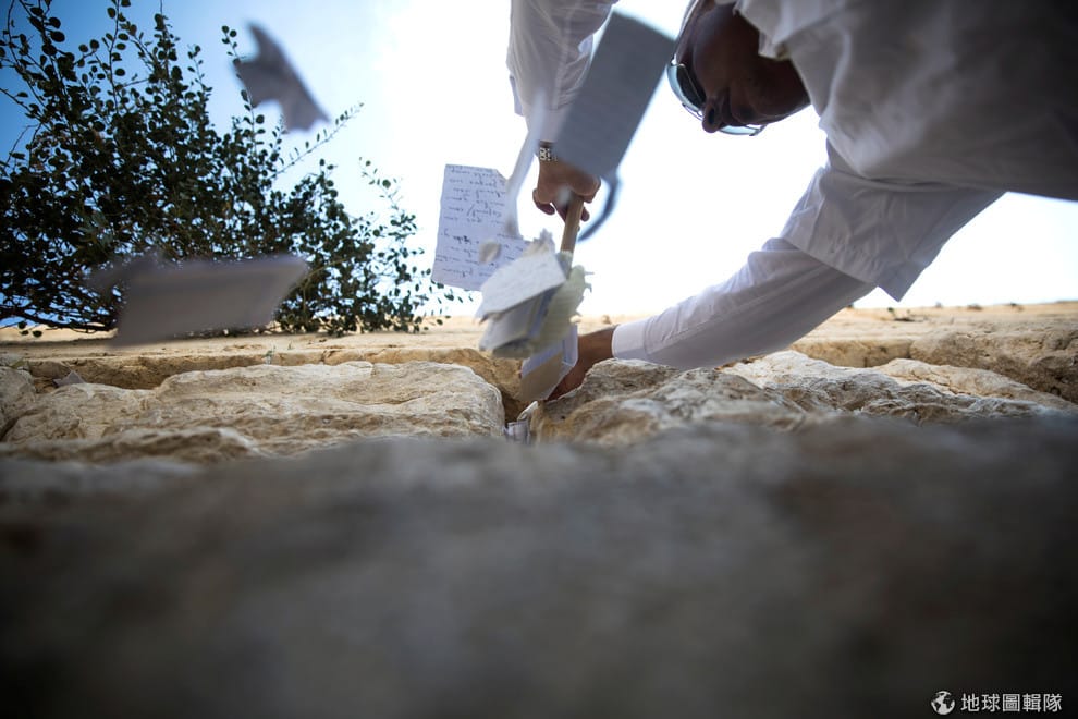 一名工作人員順著哭牆上的裂縫,將擺放在裡頭的訊息清了出來。