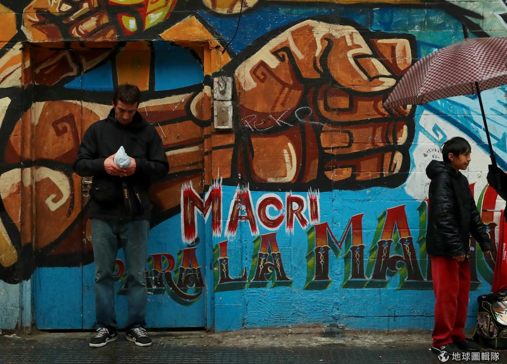 一名男子走過寫有「馬克里,下台」的塗鴉,馬克里(Mauricio Macri)是阿根廷總統。