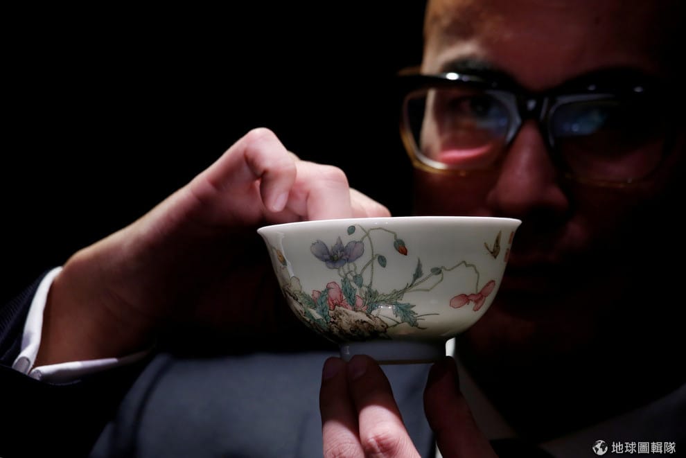 在蘇富比(Sotheby)的香港拍賣場,一名工作人員向媒體展示了來自清朝乾隆時期的法蘭瓷古董碗,這個碗將從 2,560萬美元(折台幣約 7.8億元)開始競標。