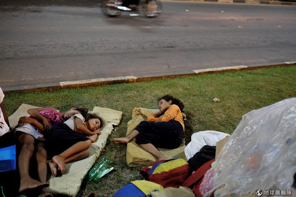 來自委內瑞拉的孩童躺在巴士站旁的草原休息著。根據聯合國統計,從 2015年開始,一共有 230萬名委內瑞拉人逃往巴西、智利、哥倫比亞、厄瓜多、秘魯等中南美洲國家,這相當於委內瑞拉總人口數的 7%。