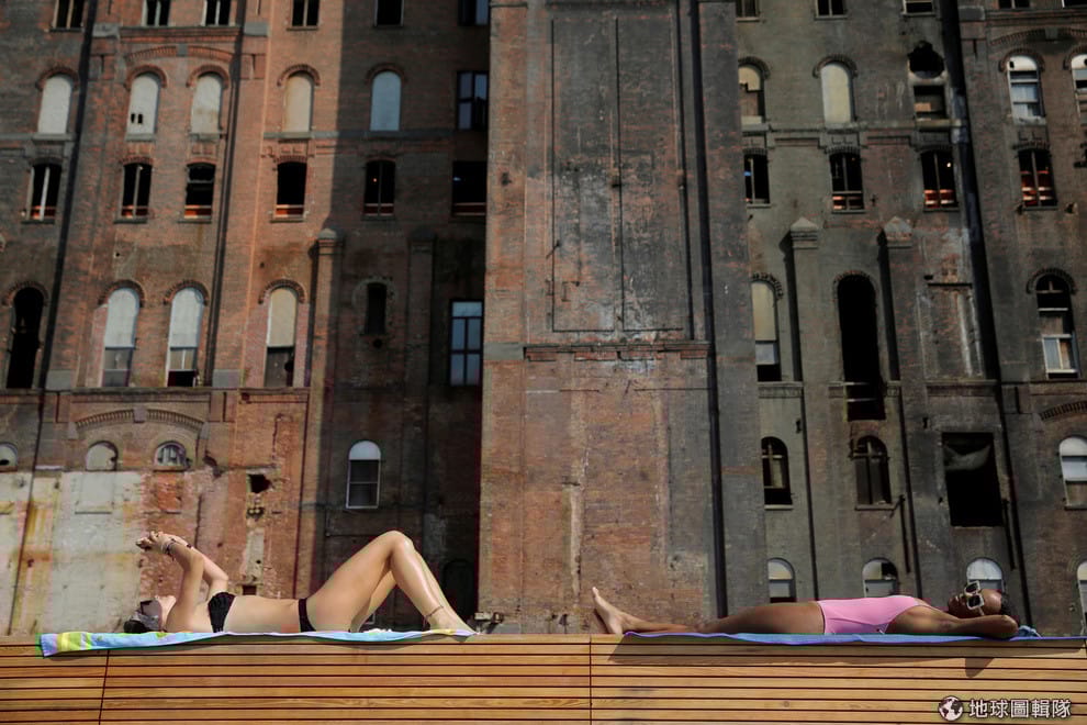 在紐約布魯克林新興的河濱公園Domino Park,身穿泳衣的人們紛紛在此享受著夏日的溫度。