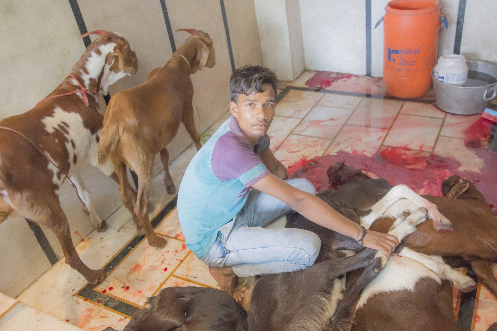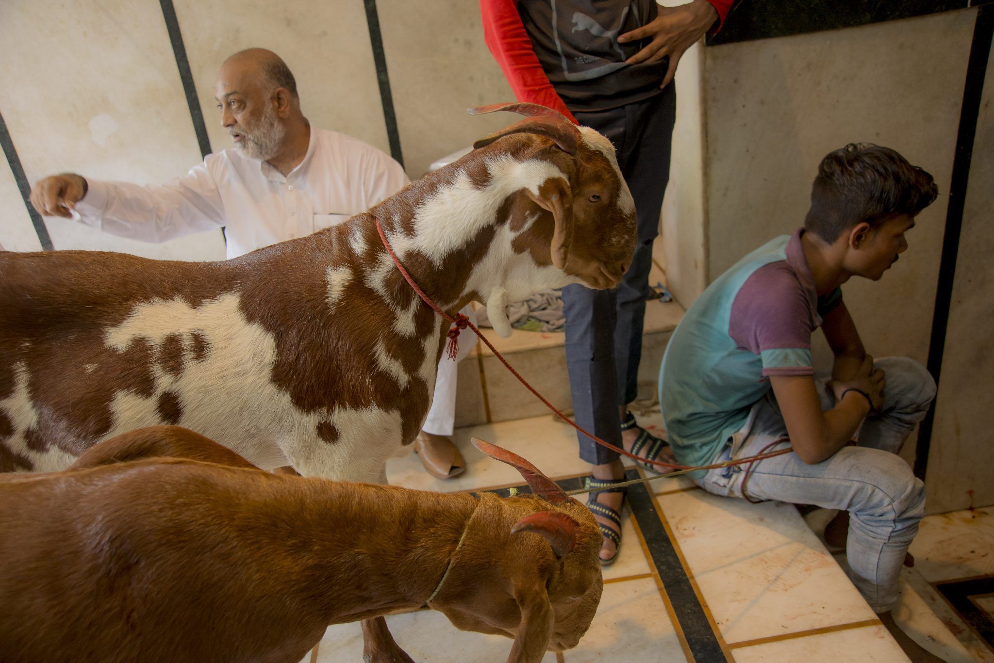 時候到了,屠夫走進屠宰所,將羊的一側抬起以絆倒羊,接著以身軀跪至羊腹,固定牠,兩人一前一後抓住羊後腿及頭部,使頸部露出。