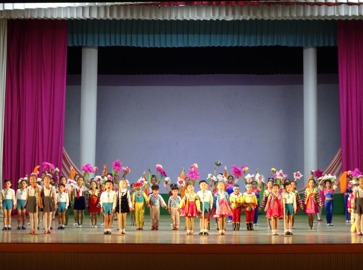 首日最後行程為羅先劇院欣賞兒童文藝演出,我本以為羅先僻處邊疆,實力不過爾爾。萬萬沒想到極為精彩,表演學生年紀約莫國小階段,先是女娃獨自蹦蹦跳跳卻毫不怯場地至舞台中央歡迎我們,隨後團隊登場合唱,無比可愛,簡直要融化大家。繼之朝鮮民族舞蹈長鼓舞、跳繩等紛至沓來,揉合雜耍、體操、舞蹈,隊形變換有模有樣,穿插北韓與西方音樂演奏與歌唱曲目,甚至還有牽著現場觀眾上台同樂的魔術表演。雖然早熟的微笑、凌厲的動作讓我有些心疼,但表演真的讓我由衷浮現「好專業」字眼!