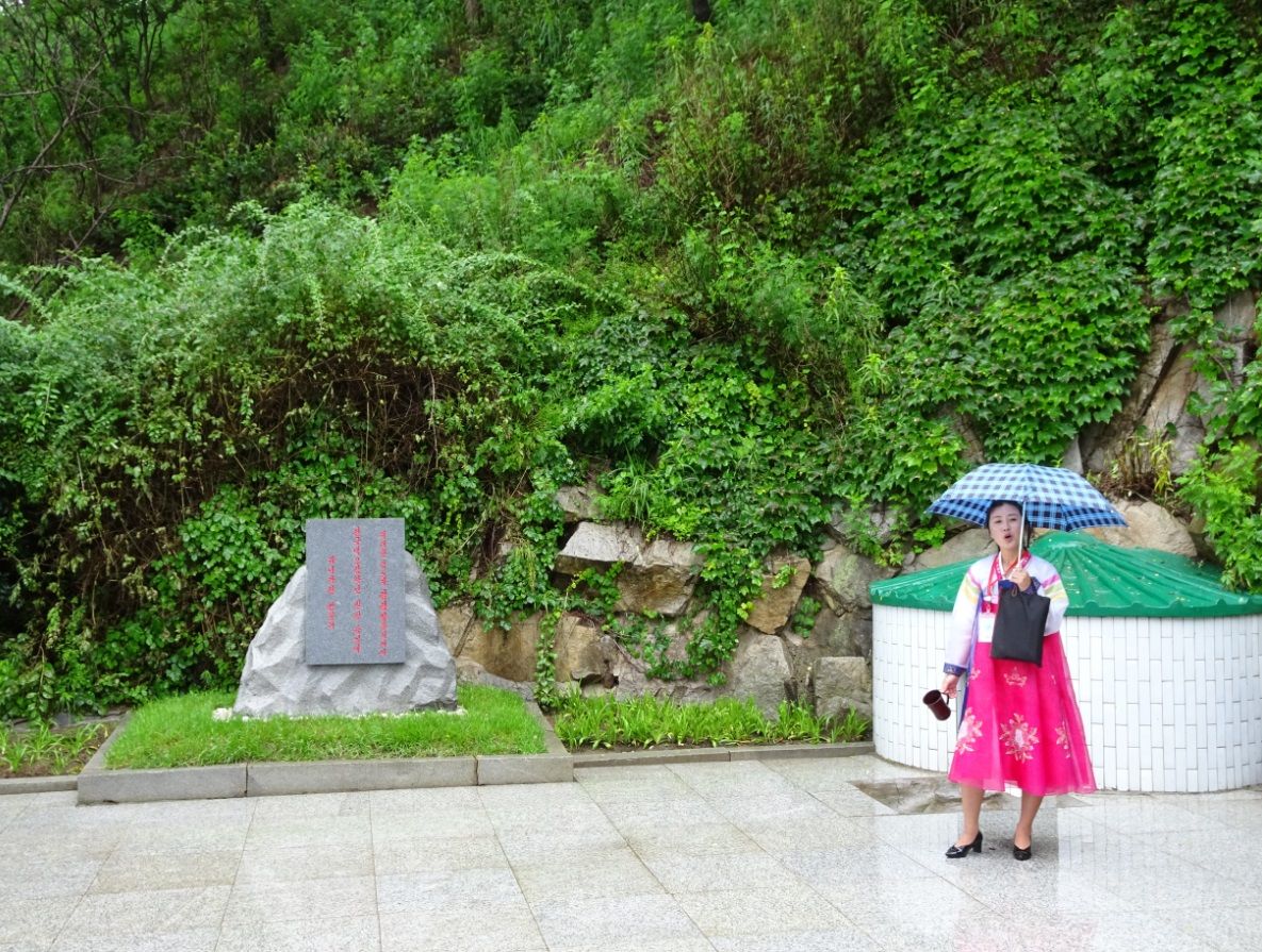 網友高紹沖撐著雨傘羅先女導遊手拿杯子,帶著大家參觀號稱金日成與金正日喝過的將軍泉。