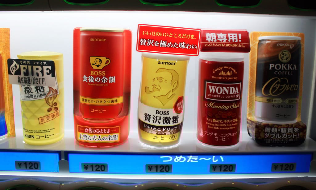圖為日本的自動販賣機上陳列著各種罐裝咖啡。