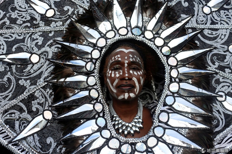 每年九月的第一個周一是美國勞動節,當天紐約市布魯克林區會出現帶有濃厚加勒比海風情的嘉年華遊行,而在此之前,有的民眾早已等不及,他們會先穿上華麗的遊行服裝參加街頭「黎明派對」(J'ouvert),從深夜狂歡到黎明,圖中女子參加的就是這樣的派對。