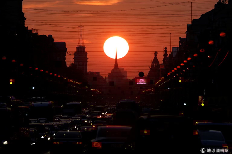 在尖峰時刻的聖彼得堡主要道路上,民眾卡在車陣中動彈不得,只剩落日美景陪伴他們度過塞車的時光。