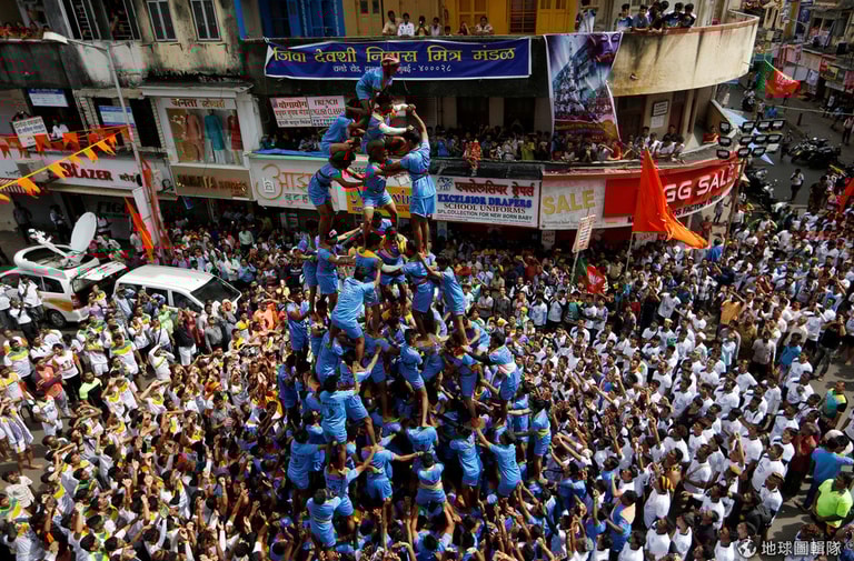 在孟買慶祝印度教黑天神(Krishina)生日的節日上,民眾搭起人體金字塔,重現黑天神小時候偷取掛在高處的優酪乳的故事,站在金字塔最高處的信徒要負責打破裝有優酪乳的陶壺。