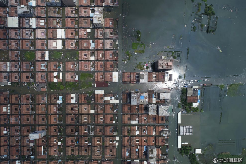 在廣東省汕頭市,連日豪雨讓當地不少房舍都被淹到只剩屋頂,這幅景象也被攝影師從高空捕捉了下來。