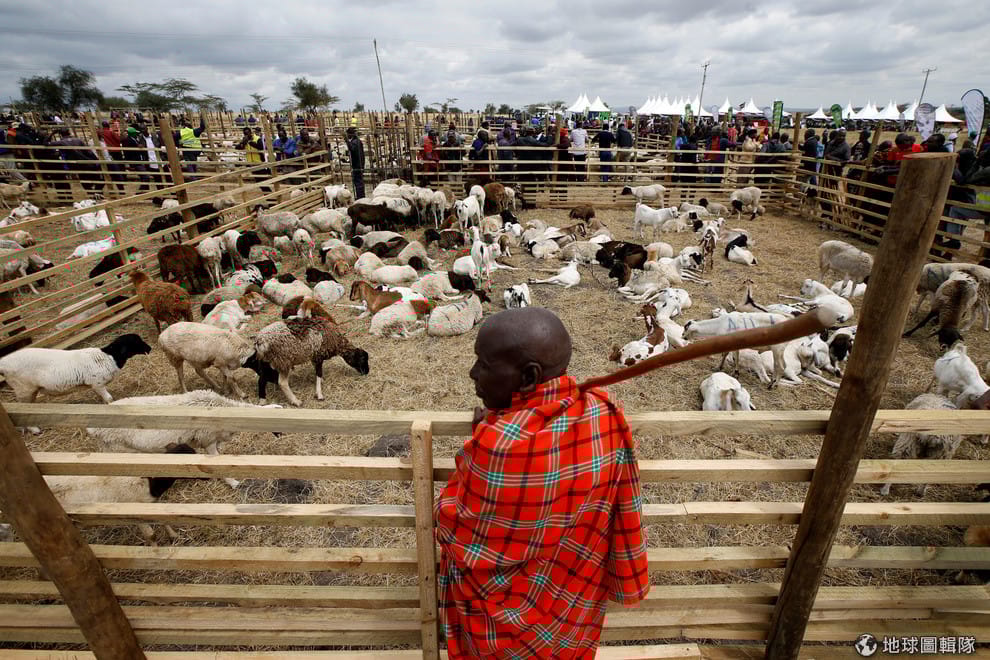 在肯亞西部卡亞耶多鎮舉辦的牲畜拍賣會上,一名披著紅色方格布的馬賽男子,準備向參加拍賣會的民眾宣傳肯亞國家醫院保險基金(National Hospital Insurance Fund),希望大家都能加入這個計畫,提供年滿 18歲的國民負擔得起的醫療服務。
