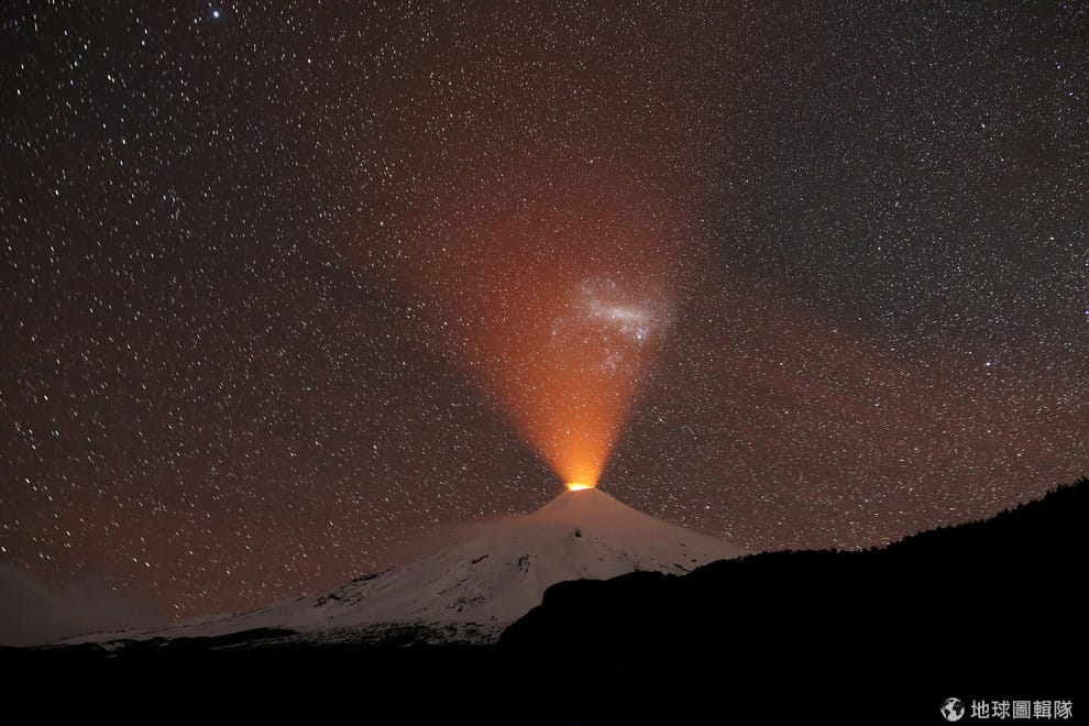從位於智利中部的普孔市(Pucón)往維利亞里卡火山(The Villarrica Volcano)看,火山滾滾熔岩形成的火光像探照燈一般,打在深夜的黑幕上,形成一幅懾人的美景。