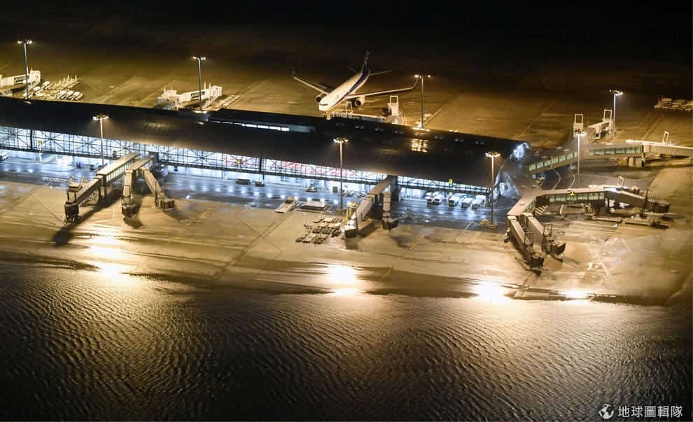 位處大阪灣上填海造陸而成的關西國際機場,因颱風夾帶大量雨勢、潮水上漲使機場滑行道淹水。