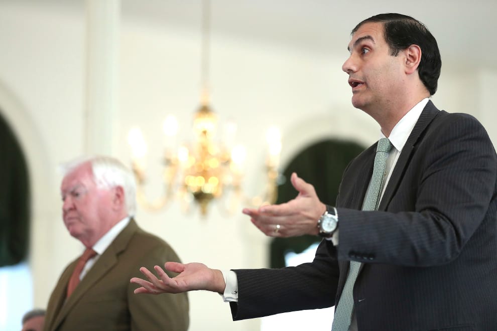 2018年9月,博比特的代表律師(左)正在和麥克盧爾、迪阿米哥的代表律師展開激辯。