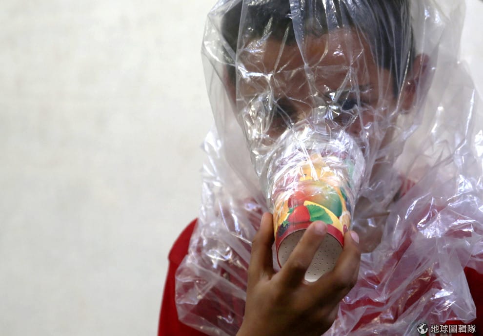 在敘利亞西北部的伊德利卜省(Idlib),一名小男孩正在試戴用紙杯和塑膠袋做成的簡易防毒面具。