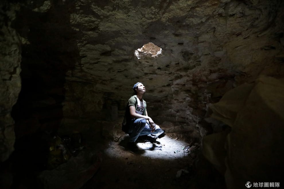 在伊德利卜省(Idlib)的地下洞穴,一名男子看著頭頂上灑落的天光,這裡是當地民眾的臨時避難所,讓他們在戰亂時有地方可躲。