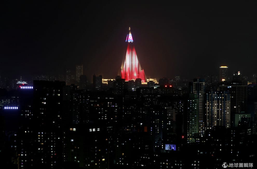 為了慶祝建國七十年,平壤樓高 105層的柳京飯店在夜晚打上了北韓國旗的顏色慶祝。