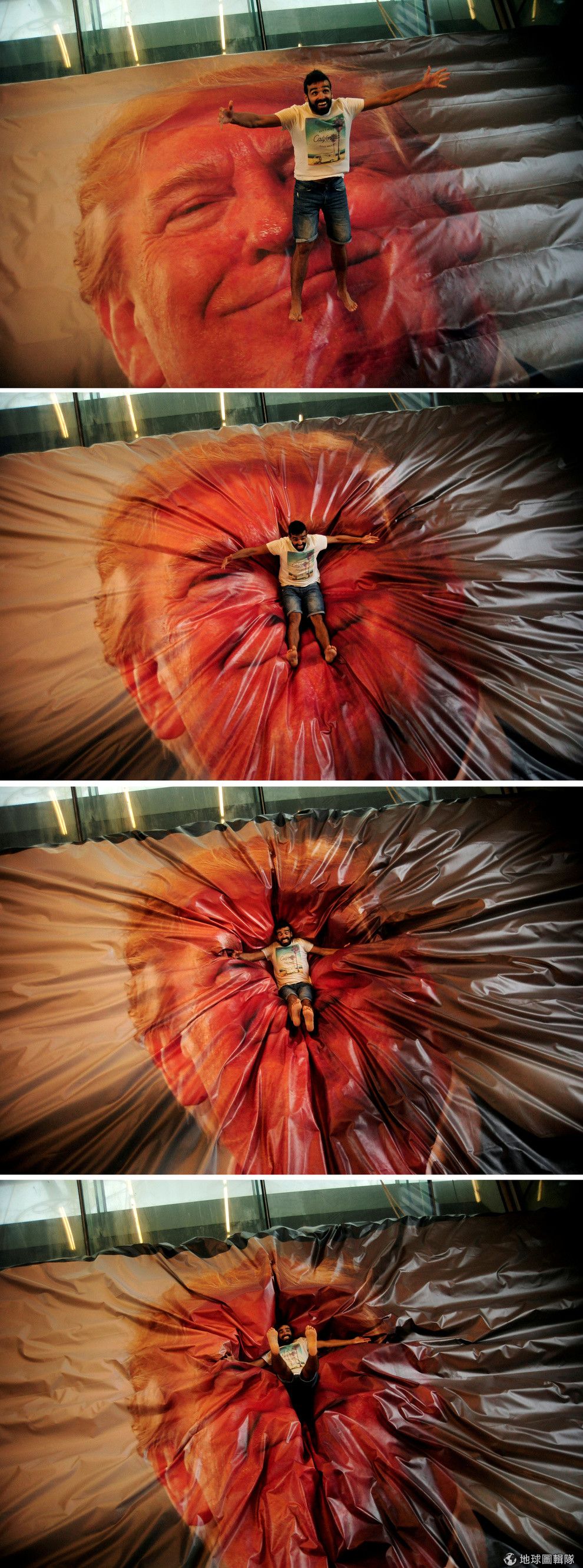 在格喬(Getxo)國際攝影展上,一名男子在印著美國總統川普(Donlad Trump)照片的充氣床上玩得不亦樂乎。