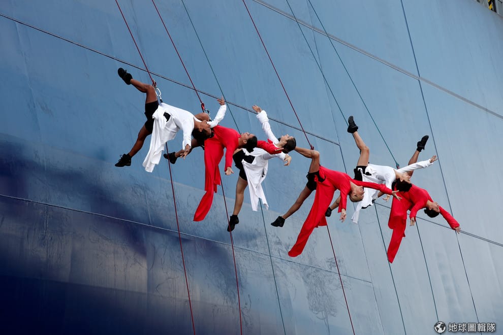 在位於塞納河河口、瀕臨英吉利海峽的利哈佛市(Le Havre),一群舞者在CMA CGM聖修伯里號(Antoine de Saint Exupery) 貨櫃船的下水典禮上表演。