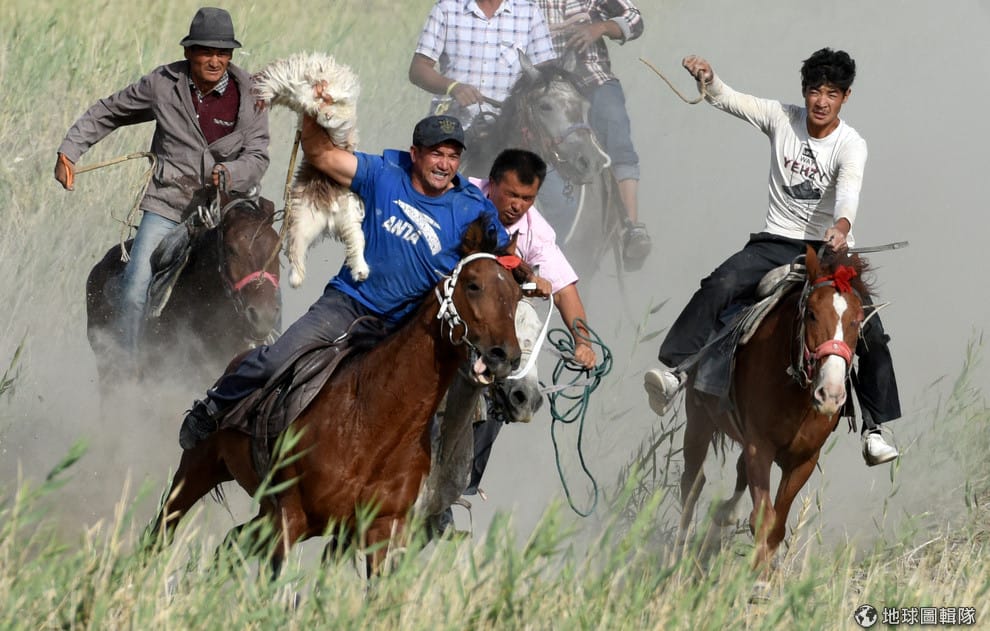 在新疆維吾爾自治區的巴音郭楞州,參加「布茲卡茲」(Buzkashi)叼羊比賽的民眾,在馬背上互相爭奪小羊的屍體,搶到的那一隊有獎。不只如此,小羊最後也會被當作餐盤上的佳餚共享,帶給參賽選手幸運。