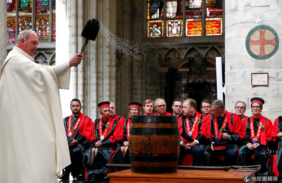 在聖彌額爾聖古都勒主教座堂(Saint Gudula Cathedral),一名神父在一群釀酒師的面前潑灑聖水、為一桶啤酒祈福,藉此向鼓勵民眾多喝啤酒的聖人阿爾努(Saint-Arnould)致敬。