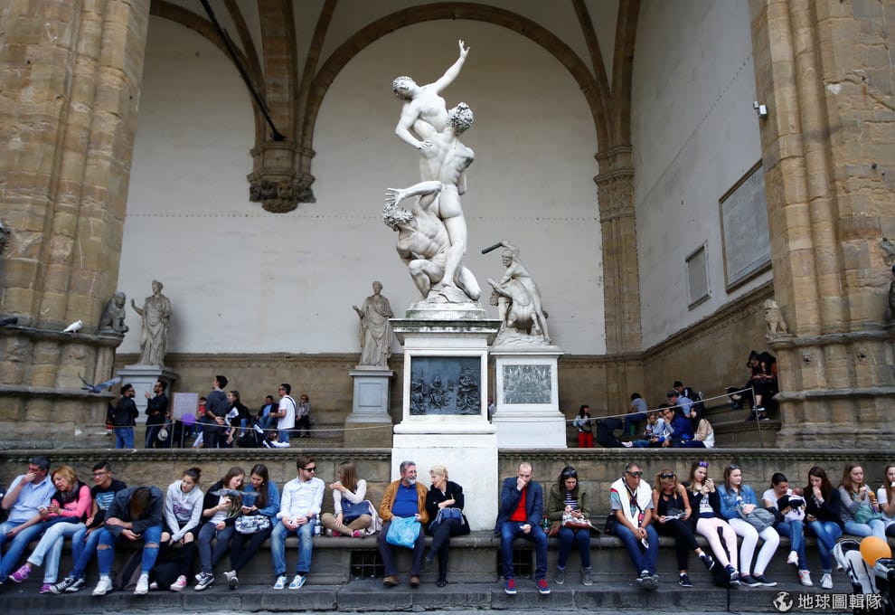在義大利佛羅倫斯舊宮前的領主廣場,觀光客們坐在石椅上休息。