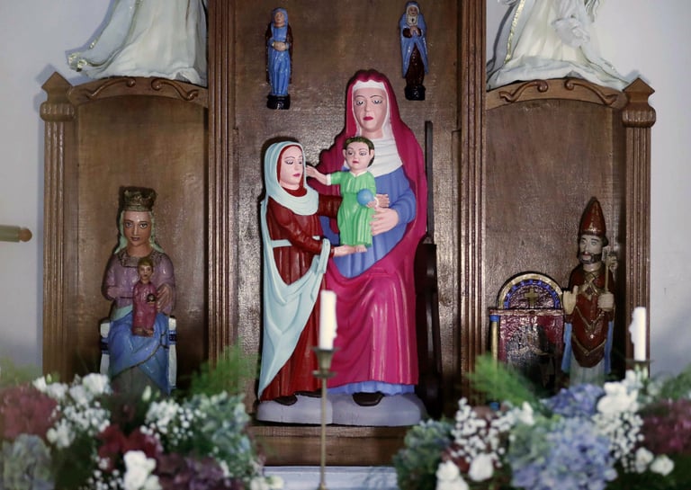 在西班牙自治區阿斯圖里亞斯(Asturias)的北部村落Rañadorio,一間座落於山丘上的小教堂擺著三尊在 15世紀留下來的木雕。在這裡,耶穌的外祖母聖安妮(St. Anne)被擦上紫紅色的唇膏和黑色眼線,身上披著亮色的披肩。聖母瑪利亞(Virgin Mary)則有著一頭綠松石的髮色。耶穌嬰兒看起來就像百貨公司裡會賣的塑膠小人。