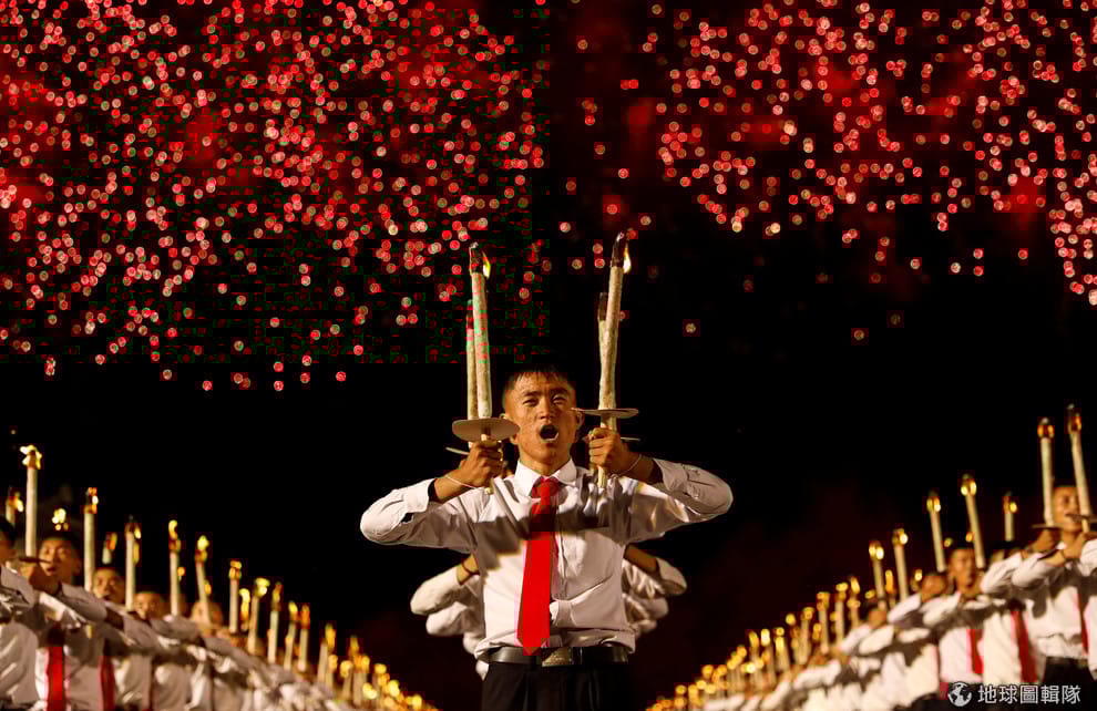 在首都平壤,參加北韓建國七十周年慶祝活動的民眾手拿冒著烈焰的火炬,搭配身後當局施放的煙火來表演。