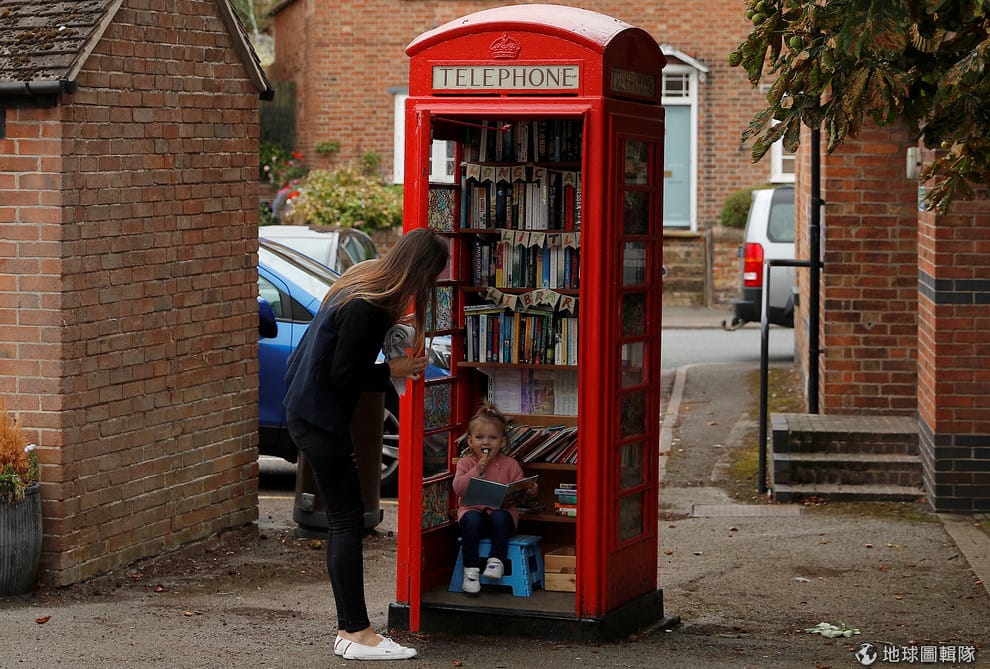 在英國南部萊斯特郡(Leicestershire)的一座小村子,今年兩歲的凱西(Aria Casey)開心地在電話亭圖書館中享受書香環繞的樂趣。