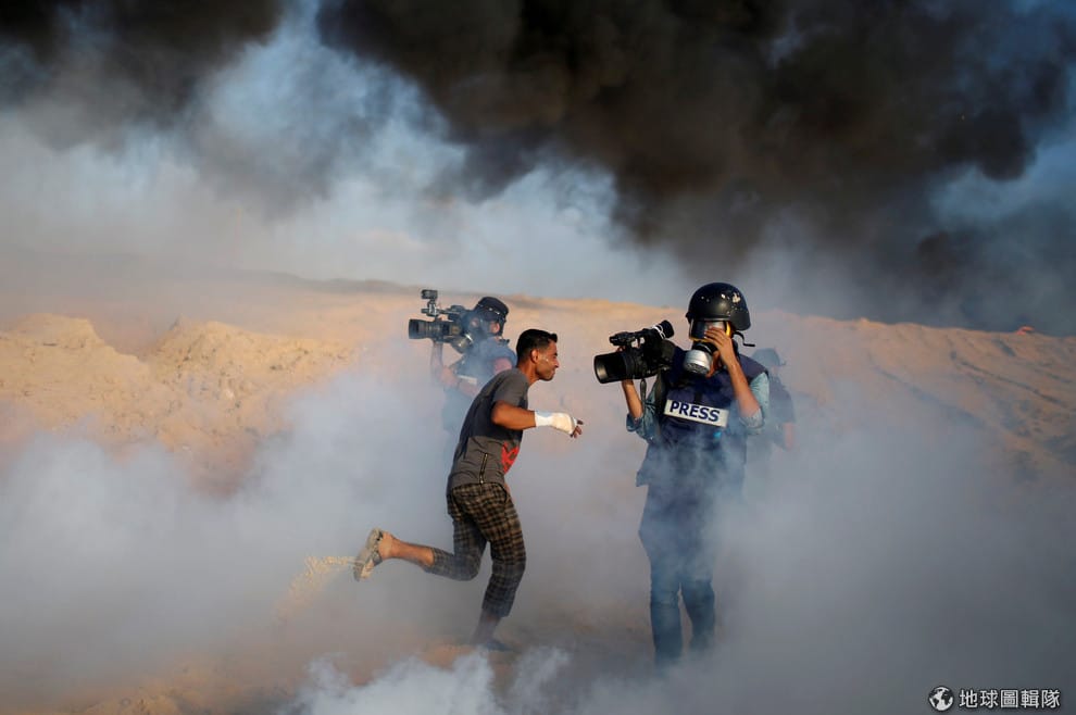 在加薩走廊北部,巴勒斯坦人在以色列軍隊發射的催淚瓦斯下四散奔逃,煙霧中出現了戴著防毒面具記錄下這一切的戰地攝影師。