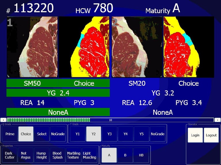 2. 屠體的成熟度(Maturity):這裡指的並非牛隻實際的年齡,而是牠的生理成熟度。評選人員會檢視牛隻的骨骼結構和瘦肉顏色來判斷,並且將成熟度評為A到E五個等級。通常,這五個等級對應的牛隻實際年齡為:A級:約 9-30個月、B級:30-42個月、C級:42-72個月、D級:72-96個月和E級:超過 96個月。