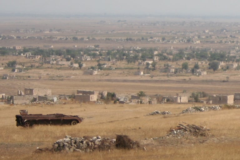 到納卡後,我一直在尋找方法前往亞格丹(Agdam)。亞格丹位於納卡東南方,緊鄰亞賽拜然邊界。興盛時曾有15萬人口,在納卡戰爭期間被大肆摧毀,如今斷壁殘垣,已無人煙,是世界十大鬼城之一。位於戰火最前線,今日的亞格丹對納卡人來說依然是高敏感禁地,談及無不色變,紛紛搖頭比出射擊的手勢,表示那裡情勢依舊緊張,希望我們打消這個瘋狂的念頭。