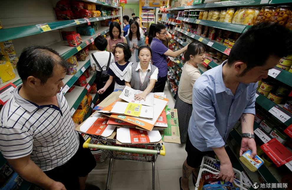 15號在深圳市,在市民忙著搶購泡麵的同時,店員則忙著進行補貨作業。可以看到部分商品已經被搶購一空。