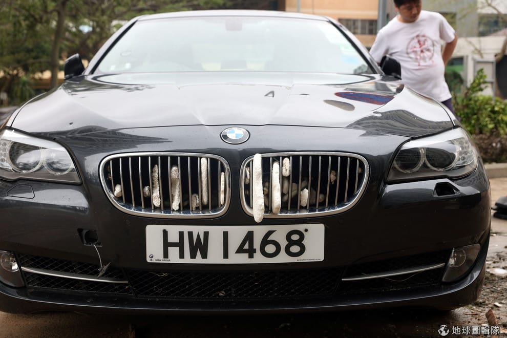 在超級強颱「山竹」經過期間,從海面上捲走了各式各樣的垃圾卡在車子裡。