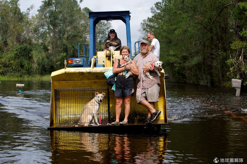 由於颶風「佛羅倫斯」(Hurricane Florence)挾帶的豐沛雨水導致河床潰堤。今年 74歲的吉米(Jimmy Shackleford)開出拖拉機,協助兒子吉姆(Jim Shackleford)和吉姆的妻子麗莎(Lisa)把他們的寵物救出來。