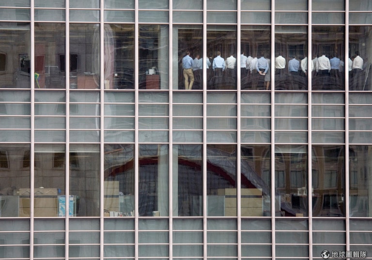 畫面中是現在已經不存在的辦公室:雷曼兄弟倫敦分部。面對公司嚴重下跌的股價,2008年9月11這天,公司召集了 20名銀行家進行緊急會議,莫爾(Gwion Moore)也是照片裡的其中一人。