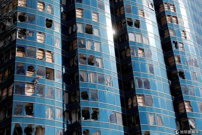 超強颱「山竹」襲擊香港後,在辦公大樓「海濱廣場一座」的窗戶留下了損壞痕跡。
