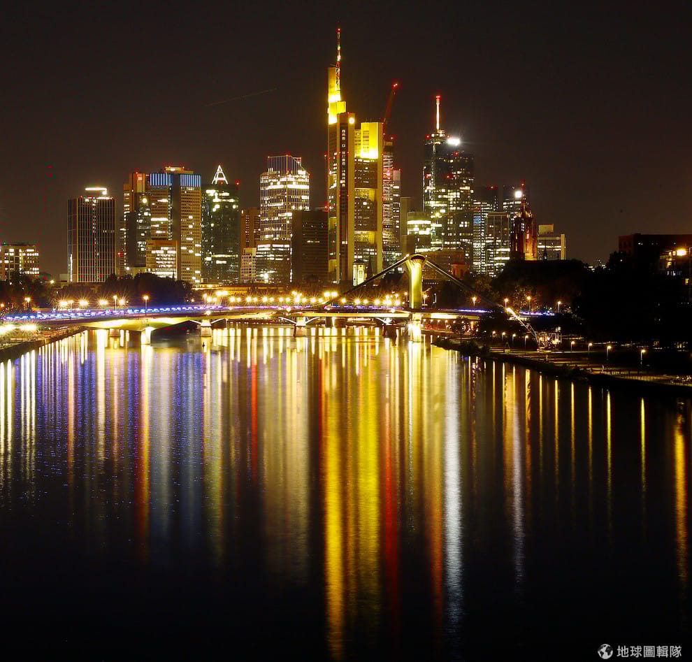 在德國法蘭克福(Frankfurt)的金融區,建築天際線在美因河(Main)上留下美麗的倒影。