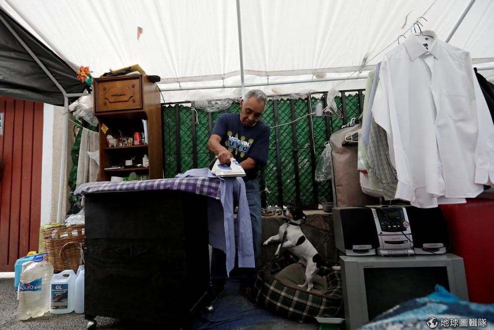 阿爾坎塔拉(Enrique Alcantara)在帳篷裡燙衣服,他本來居住的大樓在去年的地震中被毀,讓他現在只能住在臨時搭建的帳篷裡。