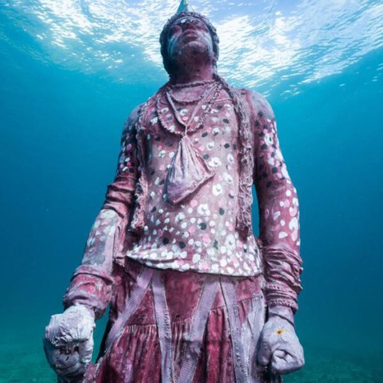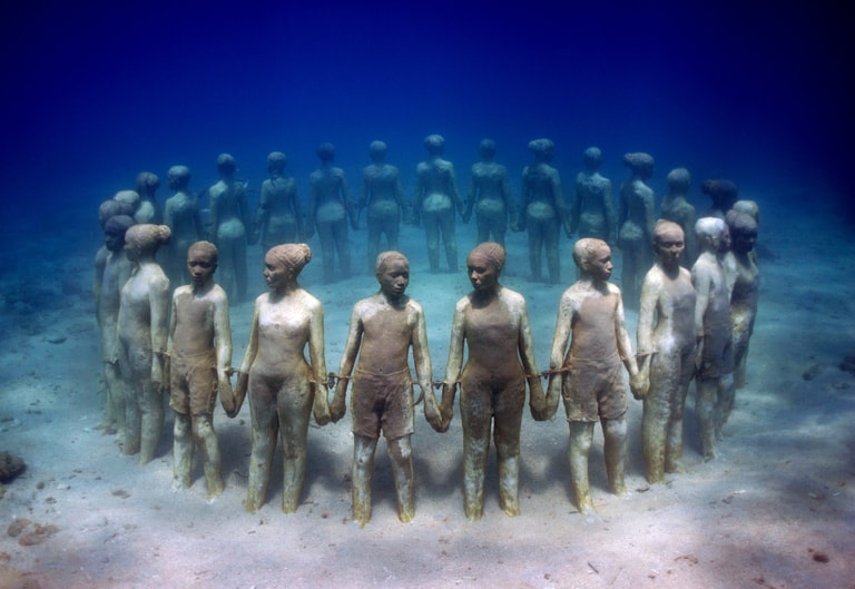 如果你有幸抵達加勒比海上的島國格瑞那達(Grenada),在西海岸的莫利內爾灣望向海底,就能看見一尊耶穌基督雕像,向著水面高舉雙手;附近,還能看見圍圈的人群、祈禱的人、坐在桌前的打字員等。他們灰色的水泥身軀佈滿海藻,有些還長出五顏六色的珊瑚,魚群也在其間來回穿梭,形成一幅人類雕塑與自然結合的奇異景象。